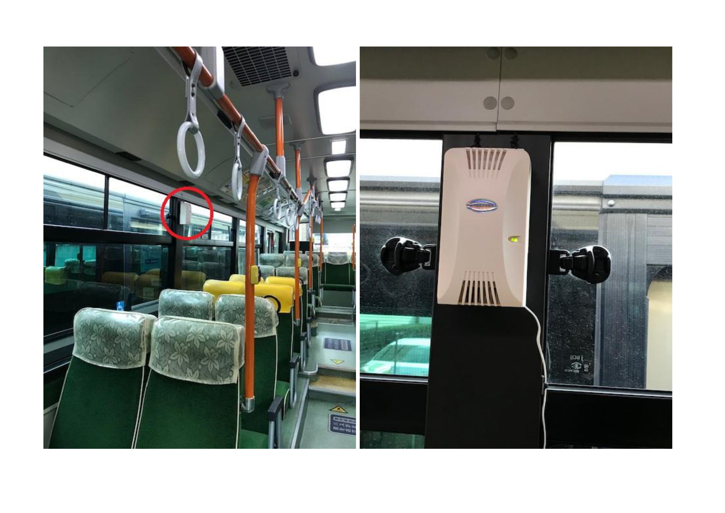今年3月、運転席の辺りにオゾン脱臭機のエアバスターを設置しておりますが、今回、オゾン脱臭機をバスの中間に設置しまして、更に確実に車内全体にくまなくオゾンが行き渡るようにしました。