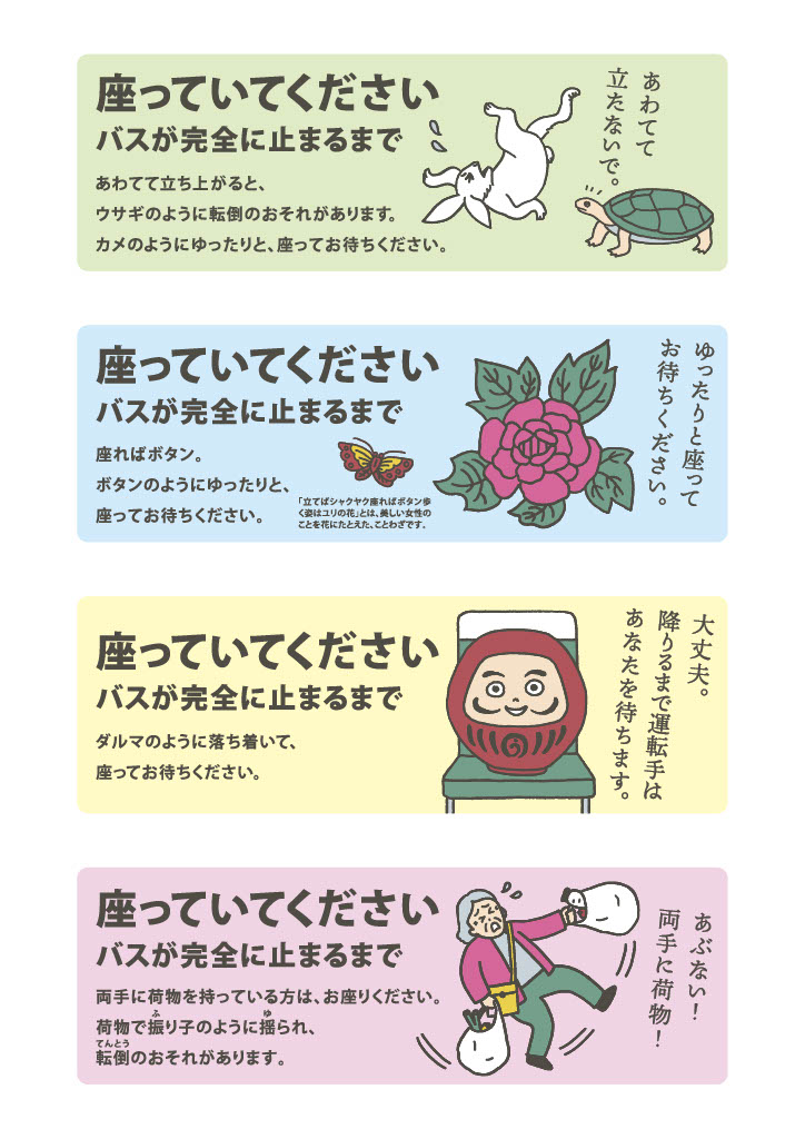 現在、バス車内の座席カバーに、車内事故防止の為に【座っていてください】という可愛いイラスト付きのステッカーを貼っています。お客様に目でも楽しんで頂けるように、イラストレーターのタケシマ レイコさんにご依頼して、作成して頂きました。