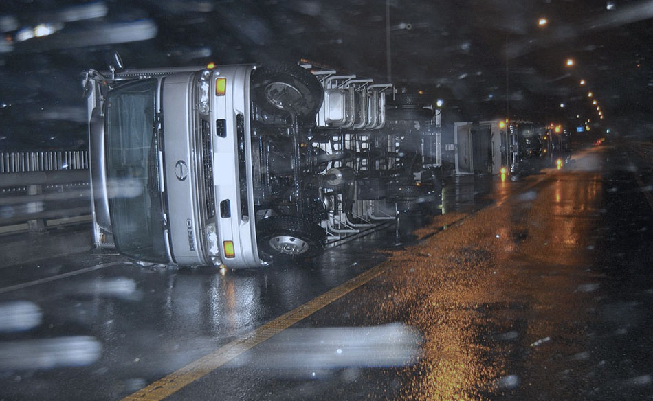 - 雨に濡れた路面を走行中の強風によるスリップの危険性